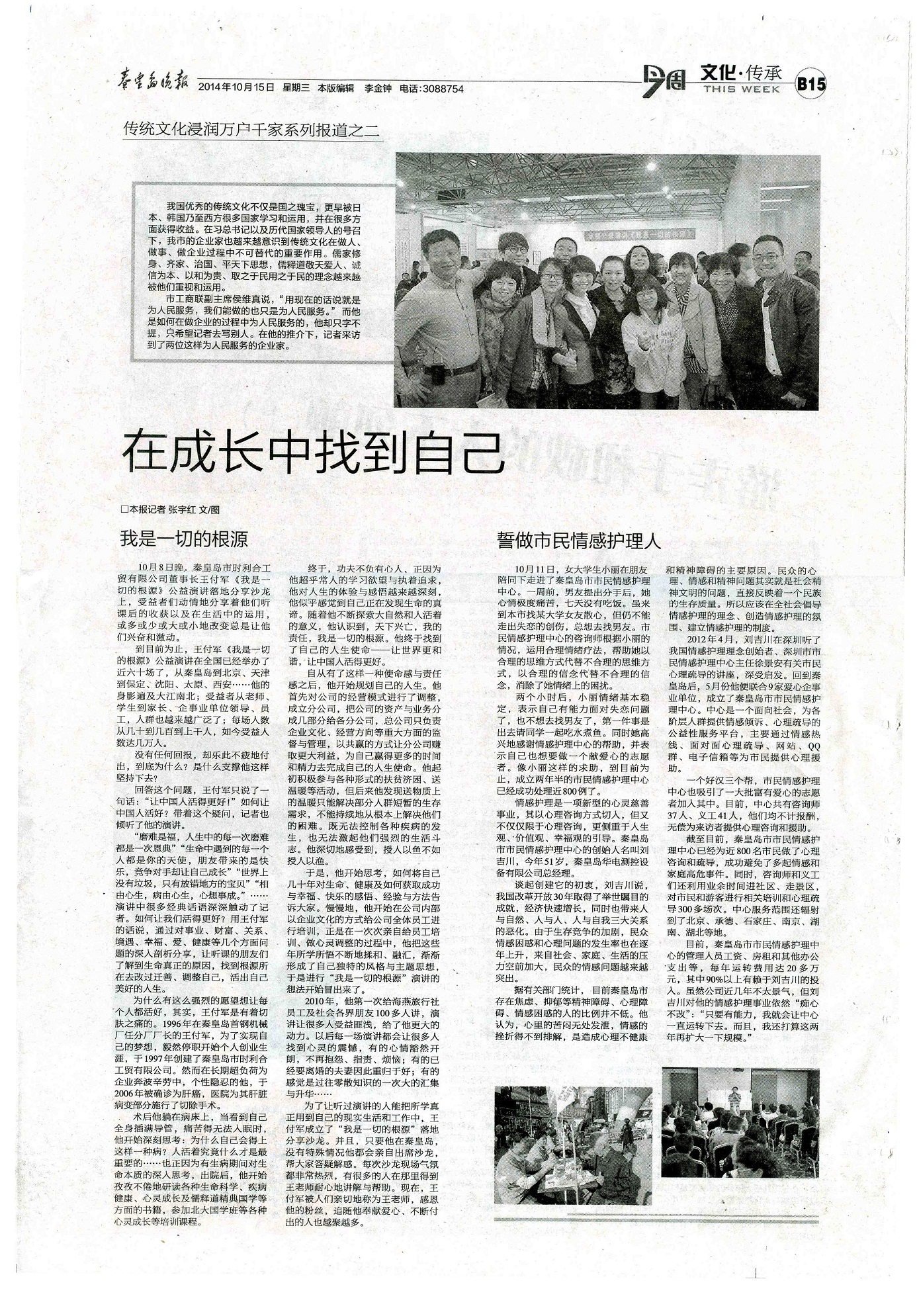 “磨難是福,人生中的每一次磨難都是一次恩典”“生命中遇到的每一個(gè)人都是你的天使,朋友帶來的是快樂,競(jìng)爭(zhēng)對(duì)手卻讓自己成長(zhǎng)”“世界上沒有垃圾,只有放錯(cuò)地方的寶貝”“相由心生,病由心生,心想事成”……演講中很多經(jīng)典話語(yǔ)深深觸動(dòng)了記者。如何讓我們活得更好?用王付軍的話說,通過對(duì)事業(yè)、財(cái)富、關(guān)系、境遇、幸福、愛、健康等幾個(gè)方面問題的深入剖析分享,讓聽課的朋友們了解到生命真正的原因,找到根源所在去改過遷善、調(diào)整自己,活出自己美好的人生。